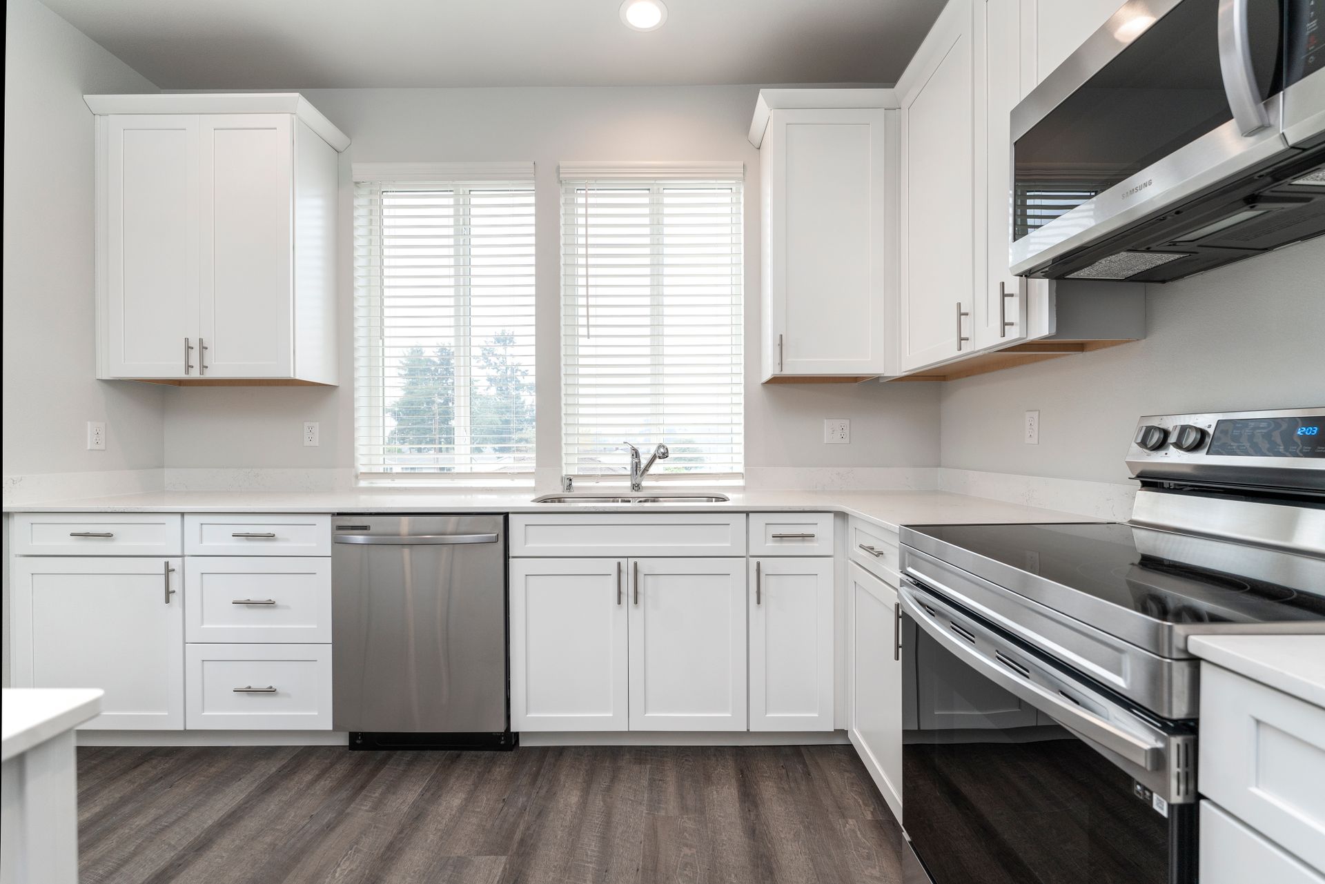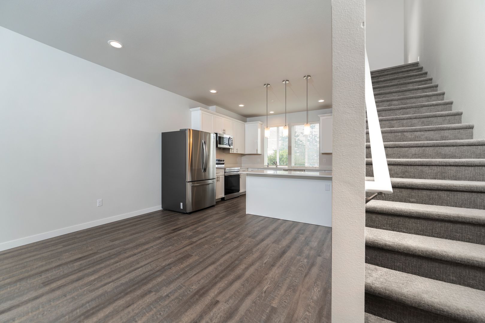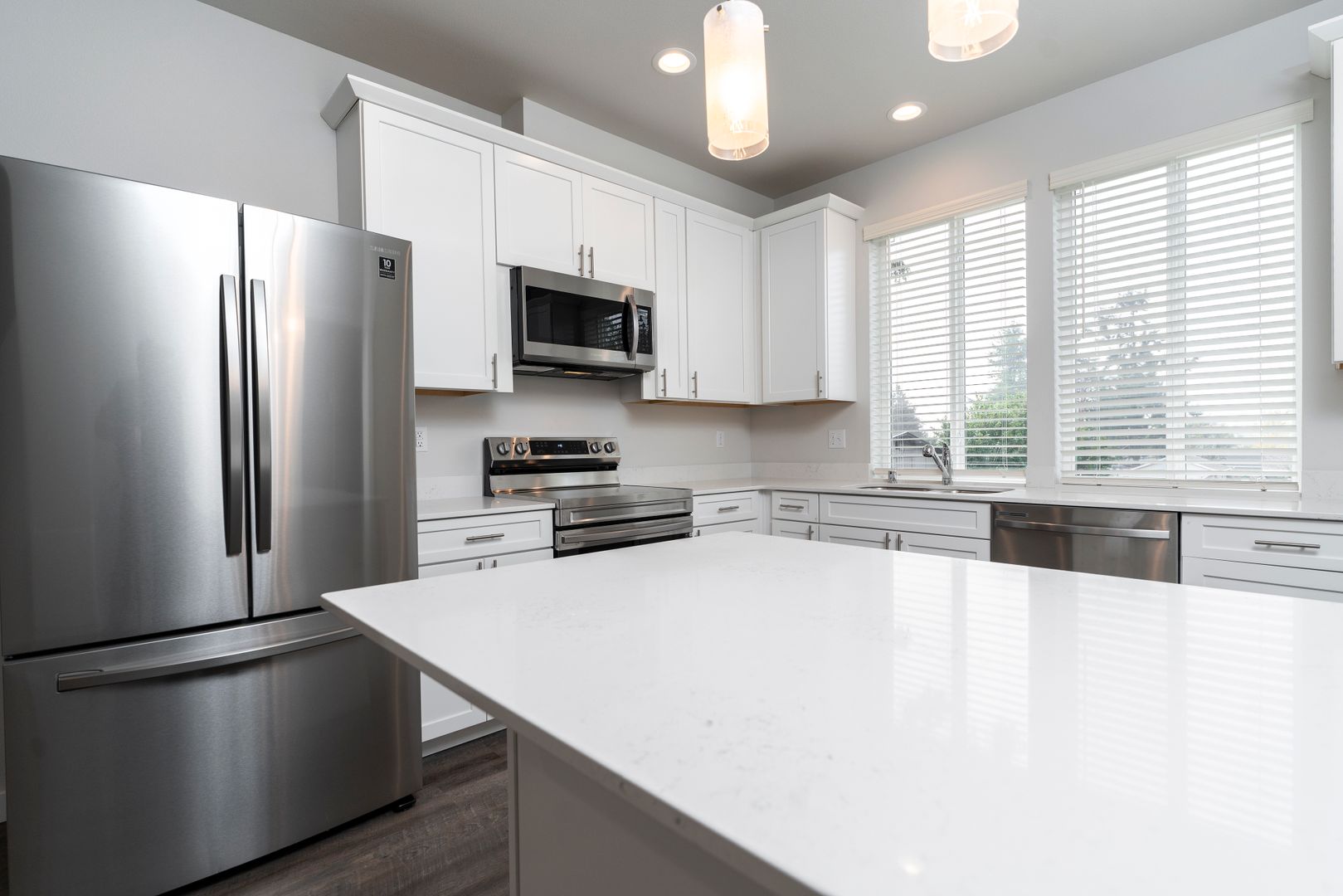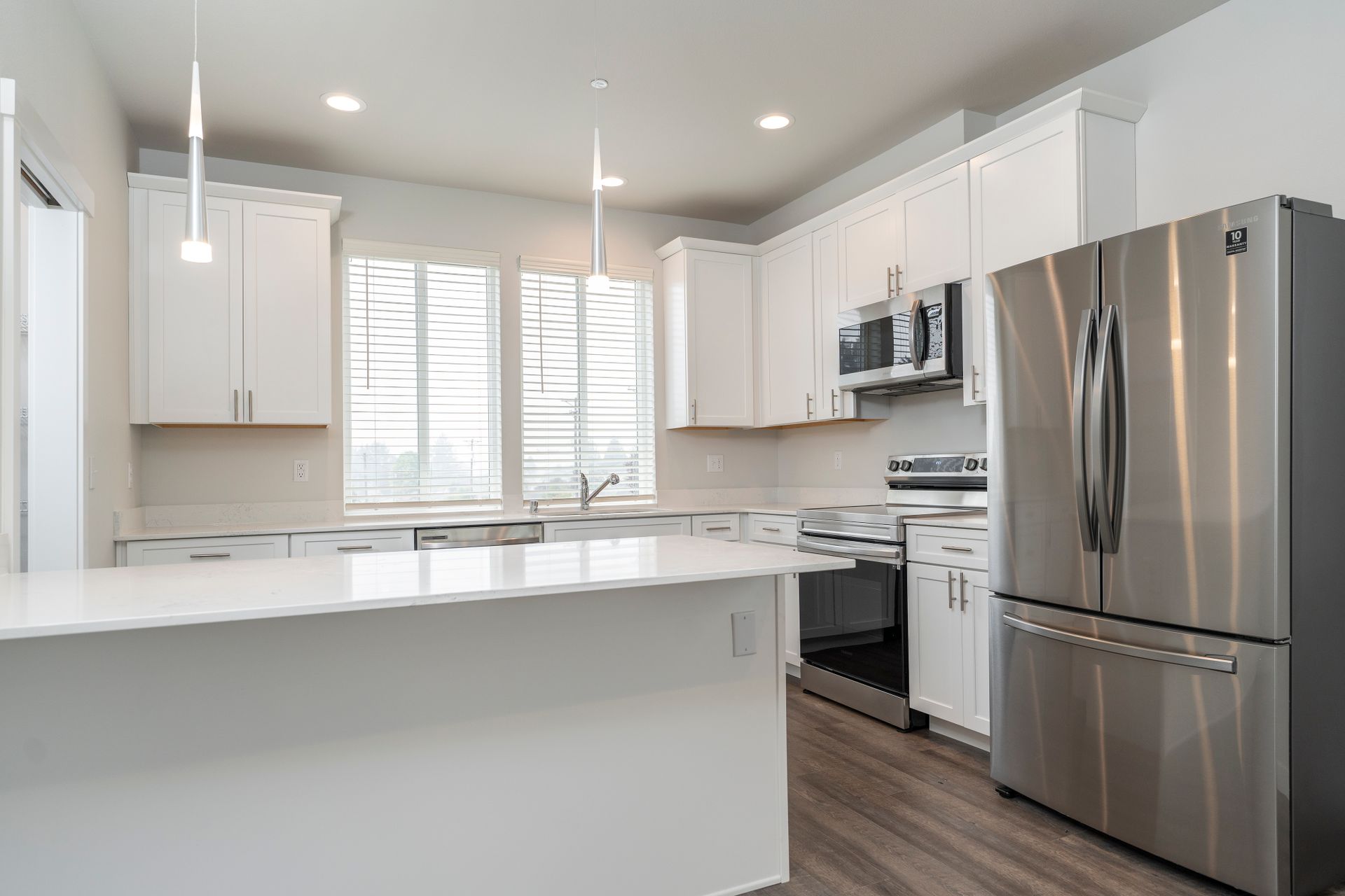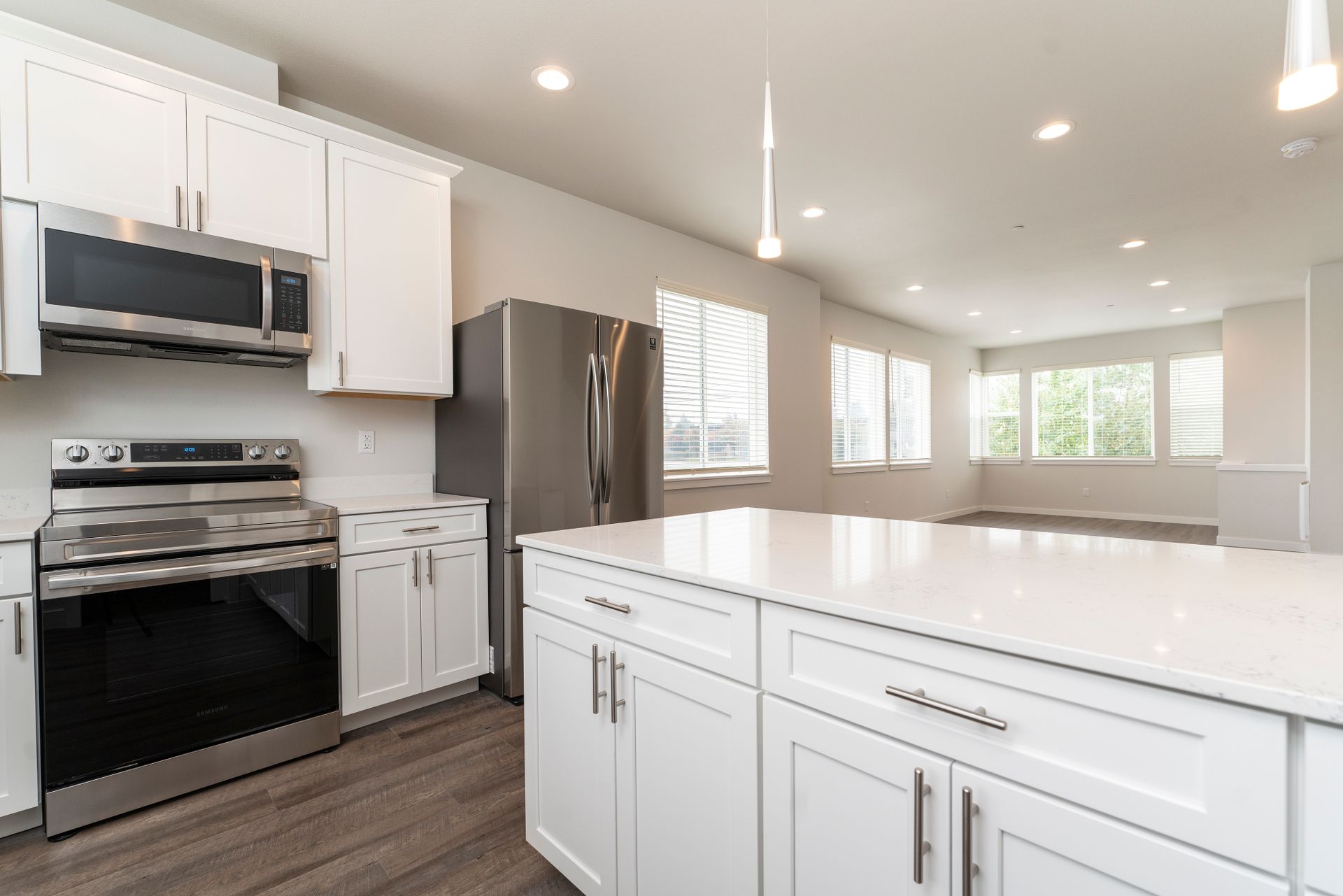 As you step into your new home, you’ll be greeted by a spacious ground-floor garage and a convenient entryway mudroom, perfect for storing coats and shoes. Head upstairs to the heart of the home, where you’ll find an open-concept living room and kitchen, featuring hardwood-like floors that create a warm and inviting atmosphere. The kitchen is a true showstopper, boasting gorgeous white quartz countertops, elegant shaker-style white cabinetry with soft-close drawers, and a full suite of top-of-the-line stainless steel appliances. These include a double-door refrigerator, dishwasher, and an oven with a hood-range microwave above for the ultimate cooking convenience. Plus, a walk-in pantry with built-in shelves provides ample storage space for all your kitchen essentials.