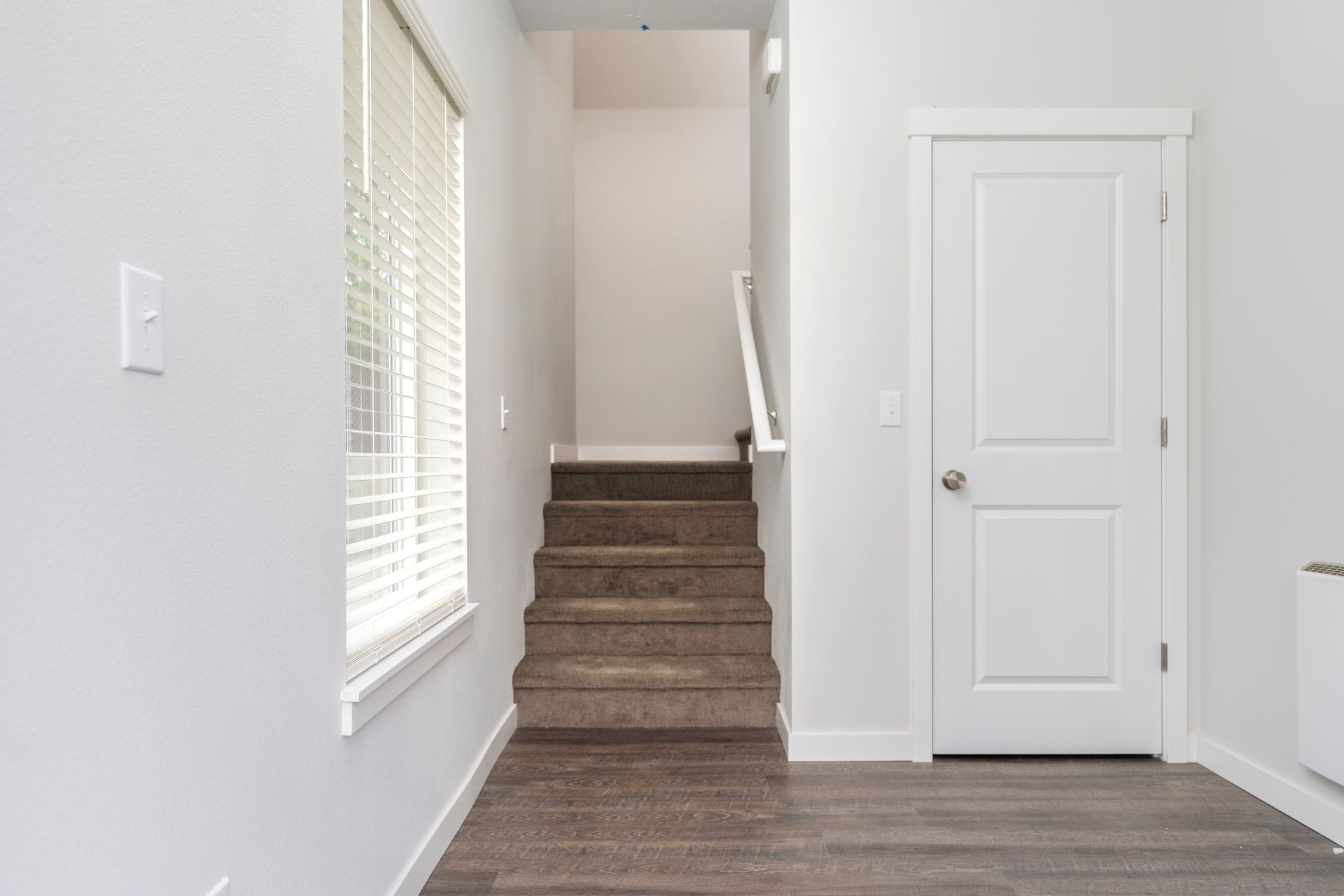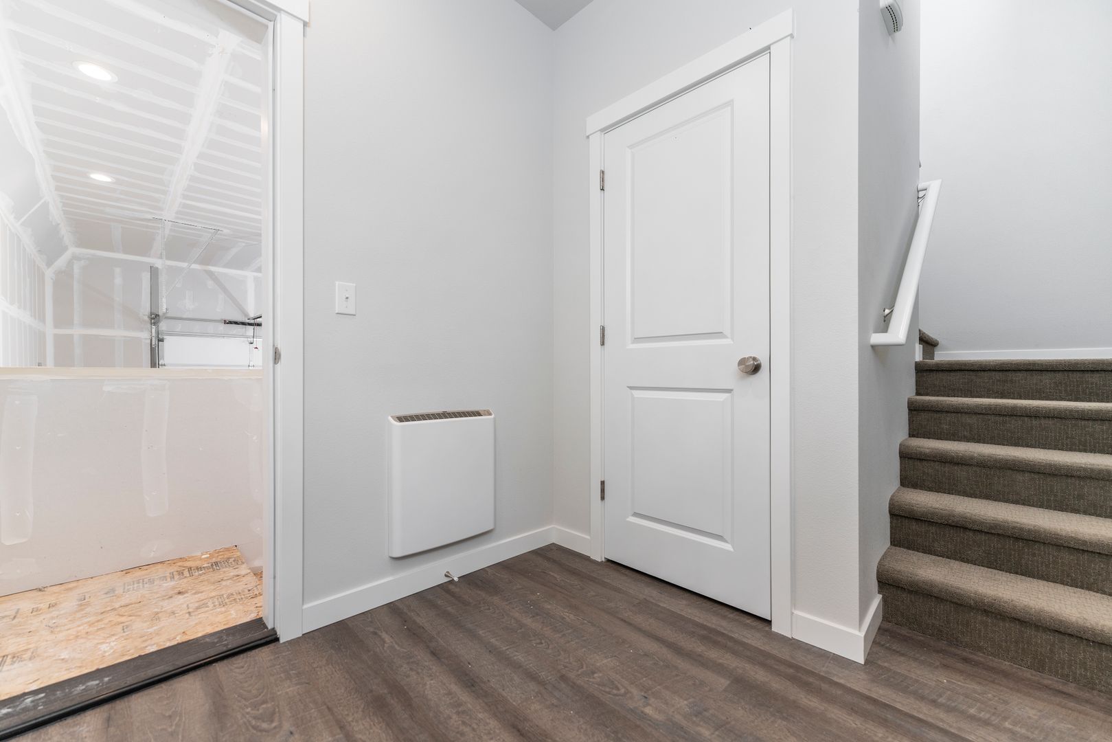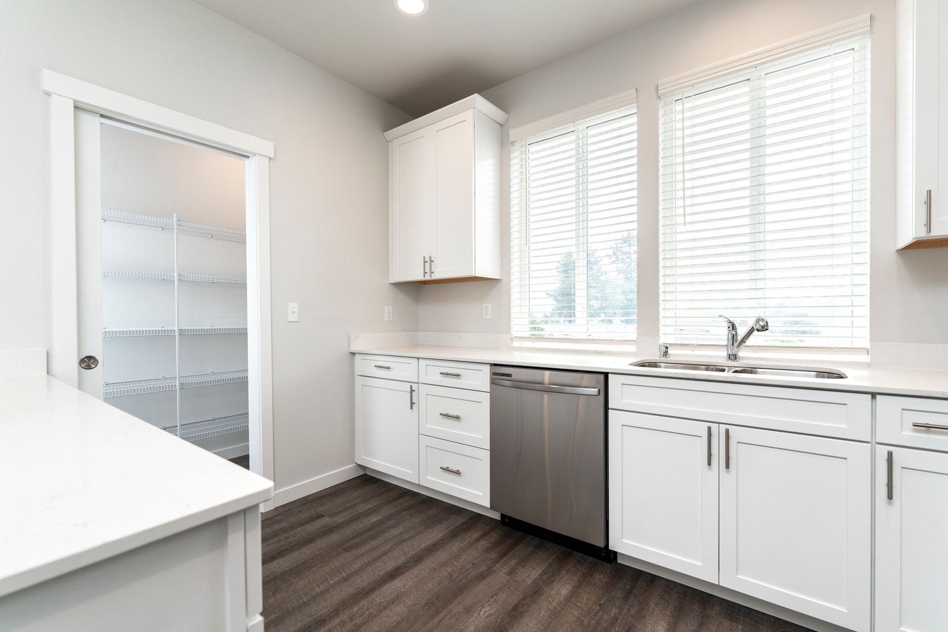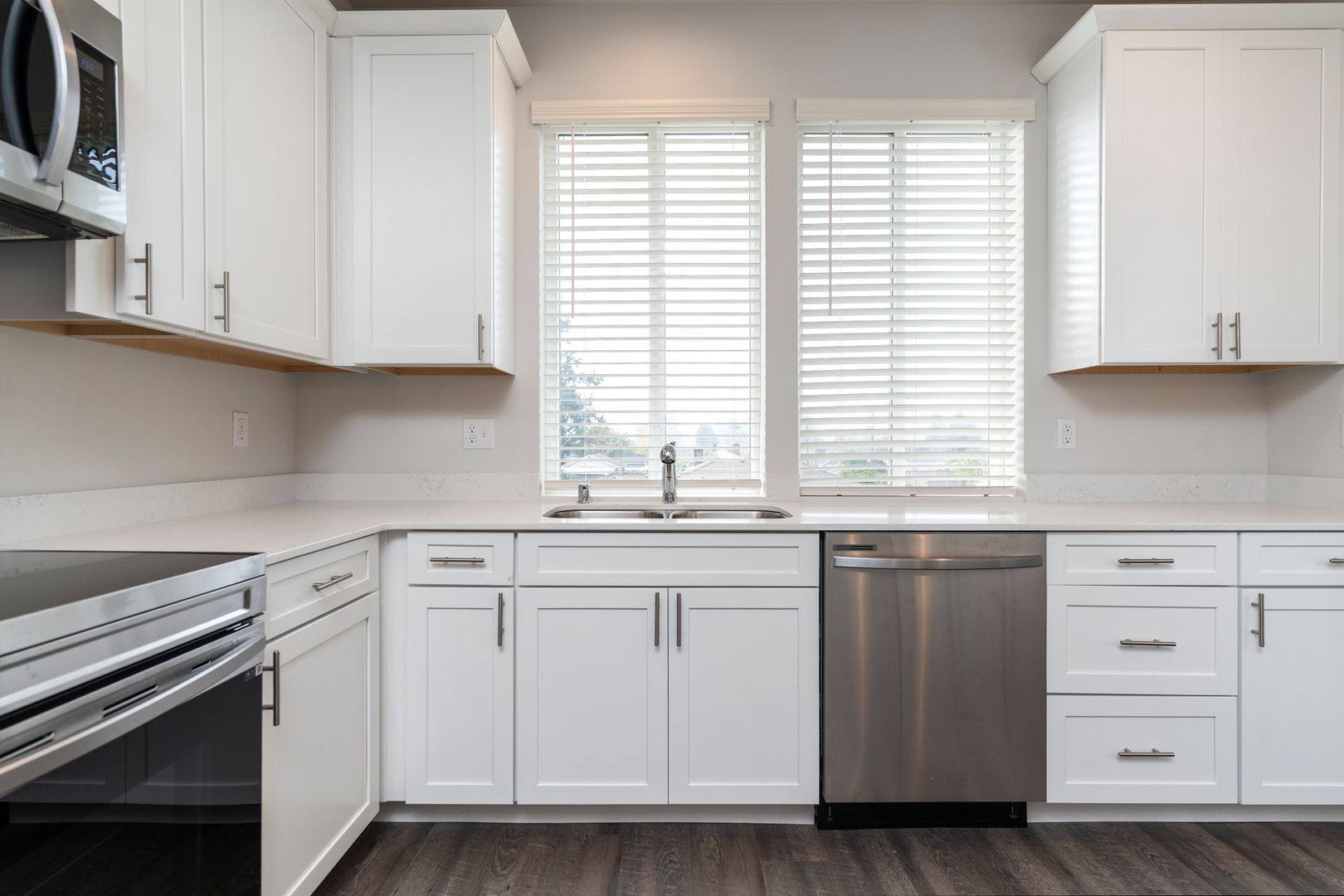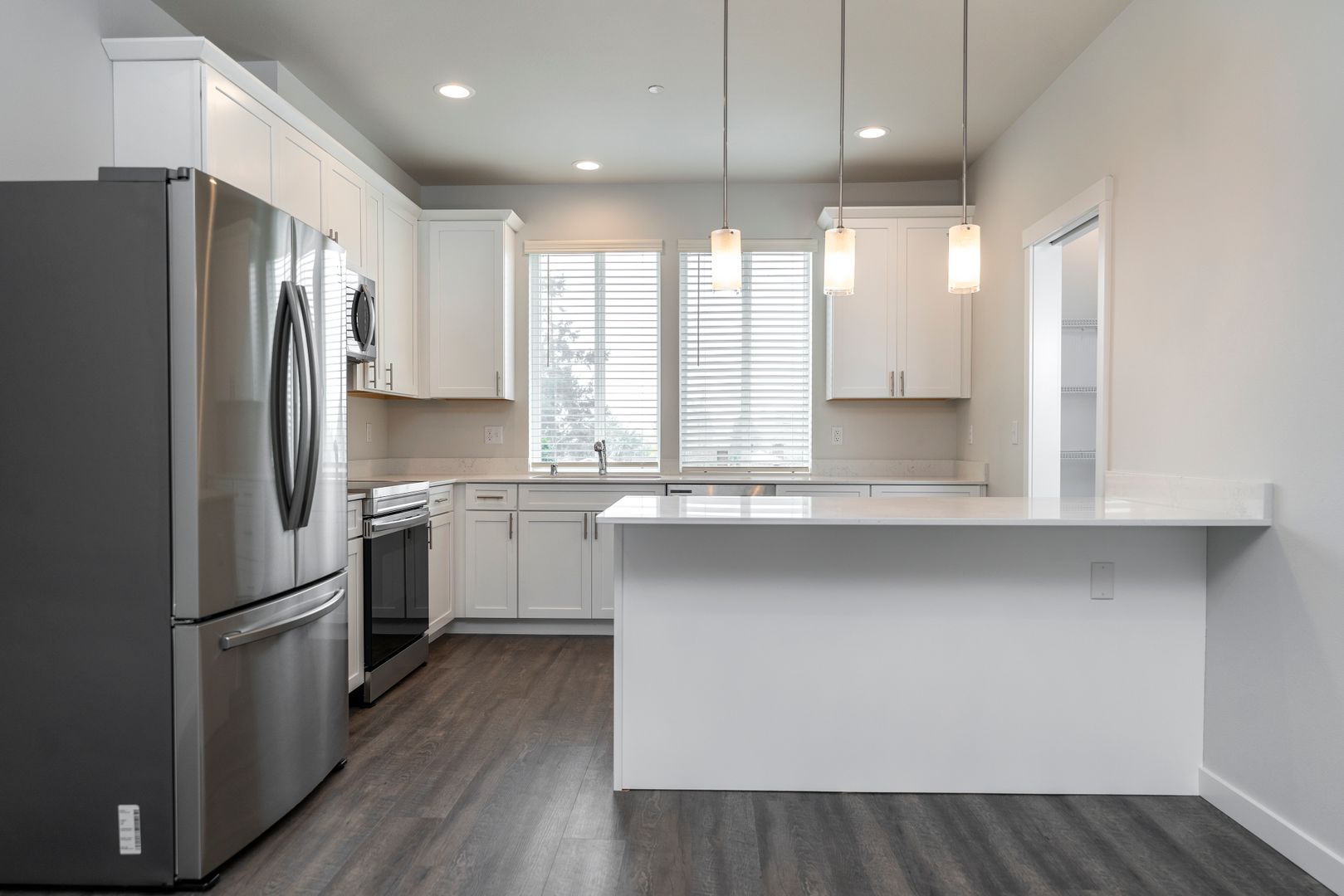 As you step into your new home, you’ll be greeted by a spacious ground-floor garage and a convenient entryway mudroom, perfect for storing coats and shoes. Head upstairs to the heart of the home, where you’ll find an open-concept living room and kitchen, featuring hardwood-like floors that create a warm and inviting atmosphere. The kitchen is a true showstopper, boasting gorgeous white quartz countertops, elegant shaker-style white cabinetry with soft-close drawers, and a full suite of top-of-the-line stainless steel appliances. These include a double-door refrigerator, dishwasher, and an oven with a hood-range microwave above for the ultimate cooking convenience. Plus, a walk-in pantry with built-in shelves provides ample storage space for all your kitchen essentials.